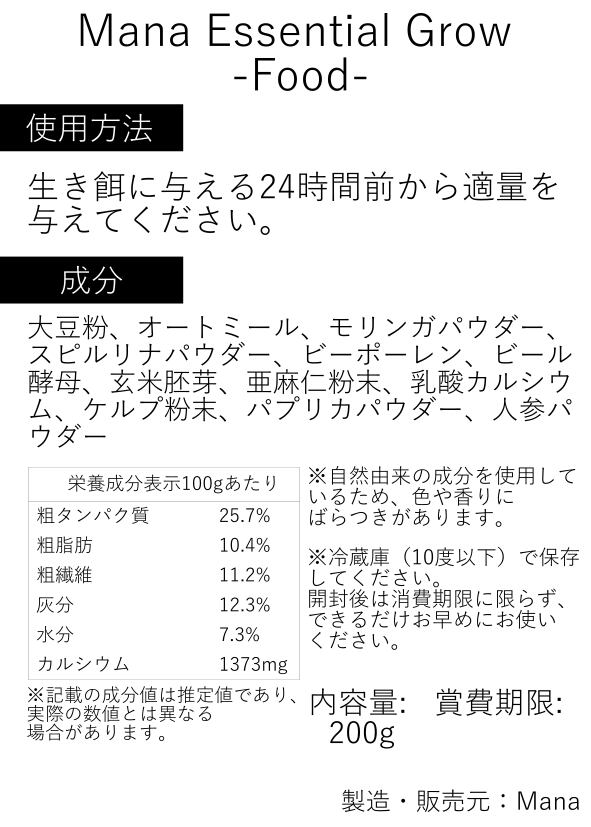 Manaが長年培ってきた知識と経験を活かし、コオロギの栄養価を最大限に高めるために原材料と配合にこだわった高品質ガットローディングフードです。